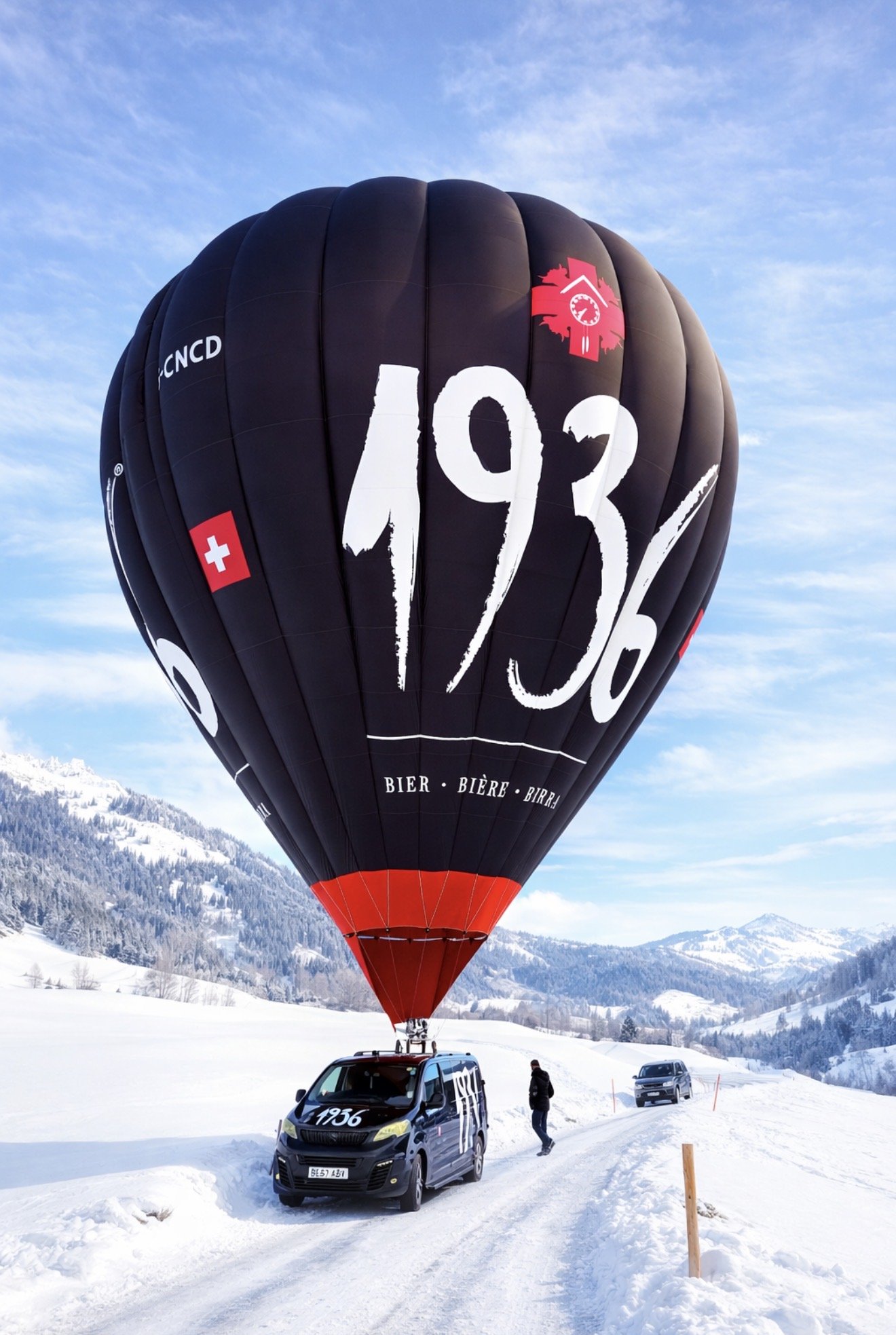The "1936 hot air balloon" refers to a custom-branded Cameron Z-105 hot air balloon created for 1936 Bière, a Swiss lager brand produced by Brauerei Locher AG.
